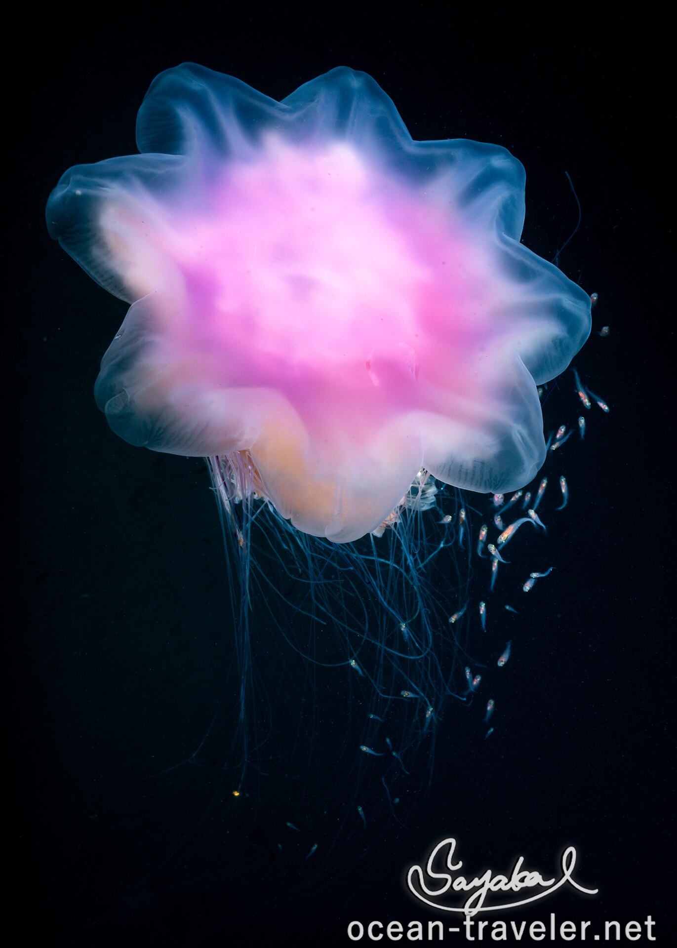 キタユウレイクラゲ。冷たい海域に生息する大型のクラゲです。傘を開いた一瞬、大輪の花のように見えます。また、ピンクの個体だったため一層花のようでした。小さな魚はスケソウダラの稚魚です。