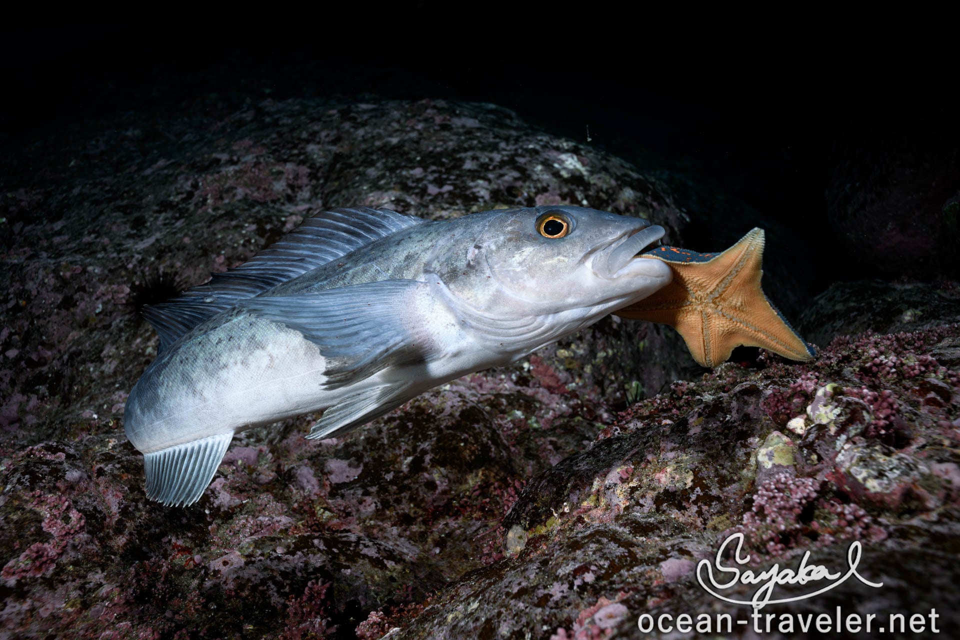 This Atka mackerel’s father was holding a starfish and trying to keep it away from their protected egg territory. Atka mackerel's father was taking care of the eggs laid by the female. There are many omnivorous creatures such as sea urchins and starfish here, and eggs are always targeted by them, for that, father always patrols. They had various personalities, such as those who are too cautious and those who do not get rid of enemies, but this individual was relaxed and did a very good eggs care.