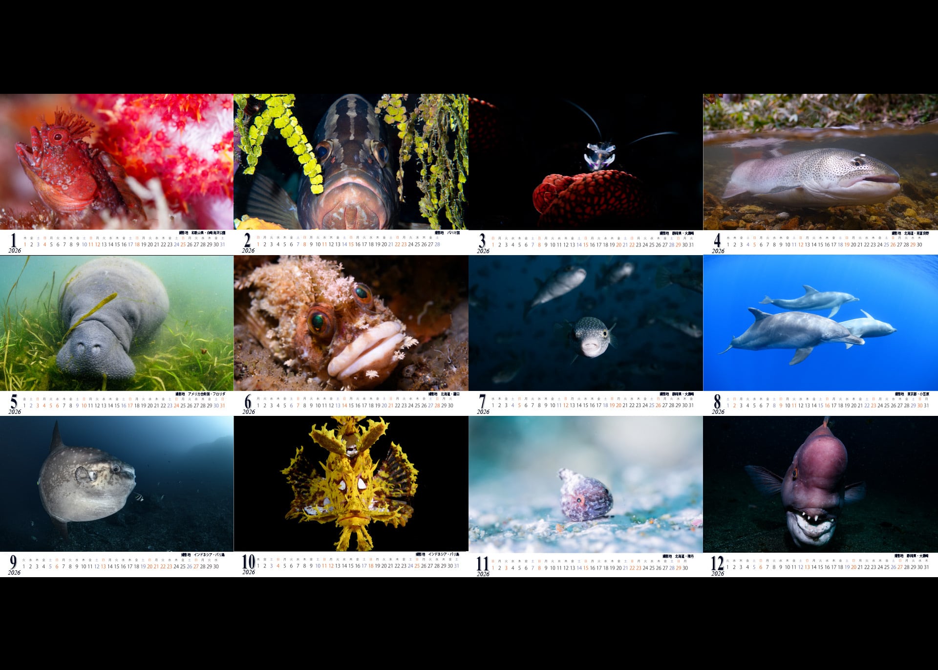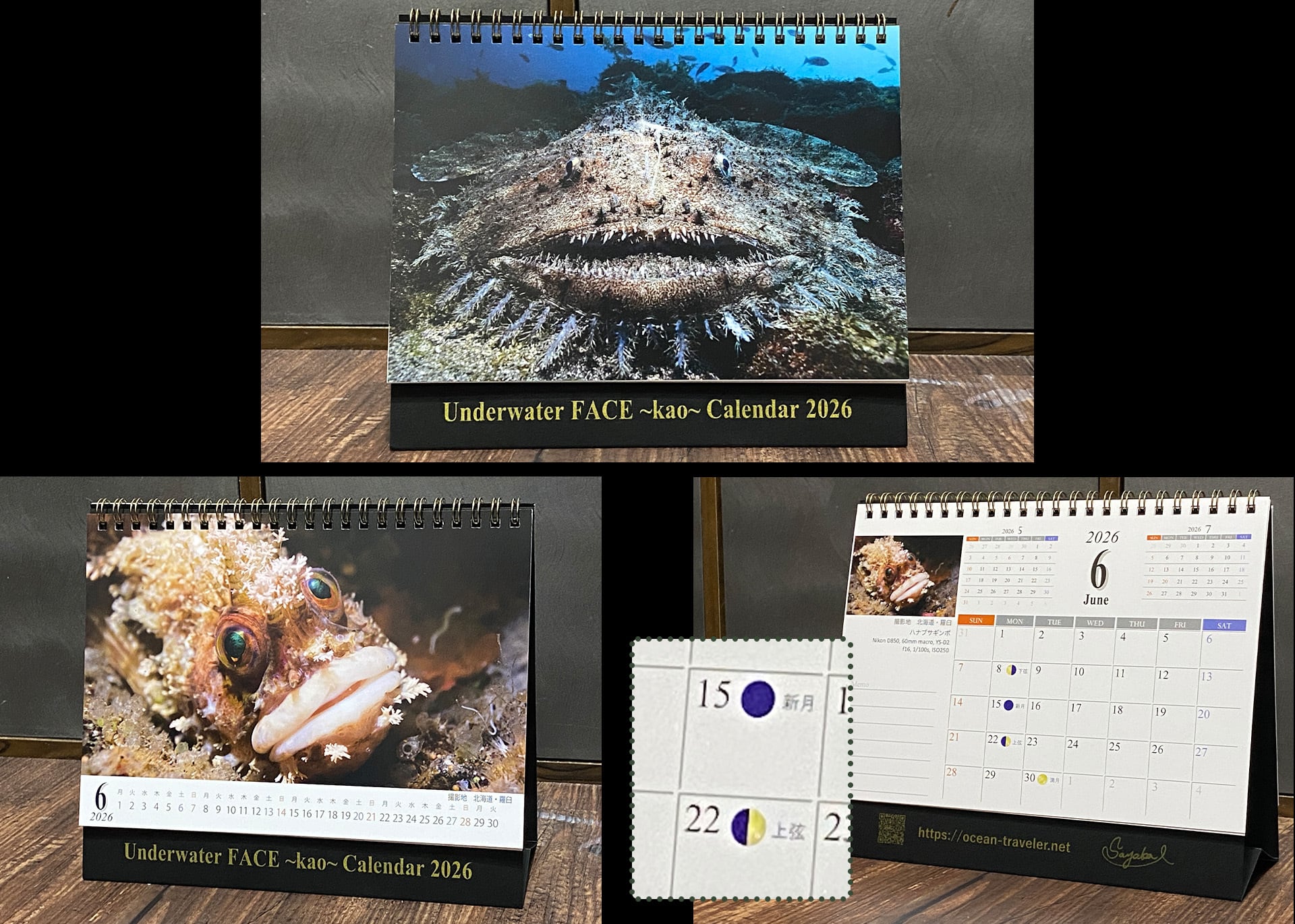 [オモテ]写真メインで楽しむ、[ウラ]スケジュール確認ができる実用性重視(鉛筆で書き込み可能)、撮影データ、ダイバーに嬉しい満月新月情報も掲載。
